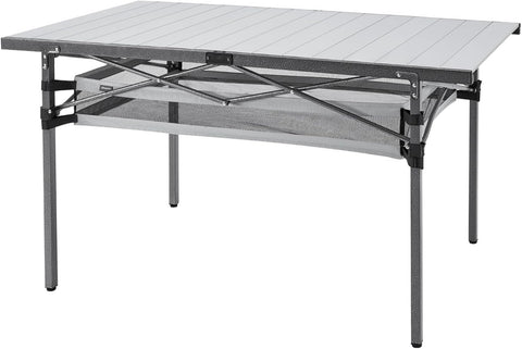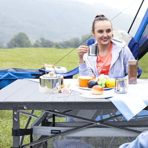 - Gemakkelijk op te zetten en in te klappen. Met het gedeelde ontwerp kan het tafelblad worden opgerold en het stalen frame met veiligheidsvergrendeling kan worden ingeklapt, zodat het eenvoudig en veilig op te bouwen of te demonteren is en de campingtafel ruimtebesparend kan worden opgeborgen.