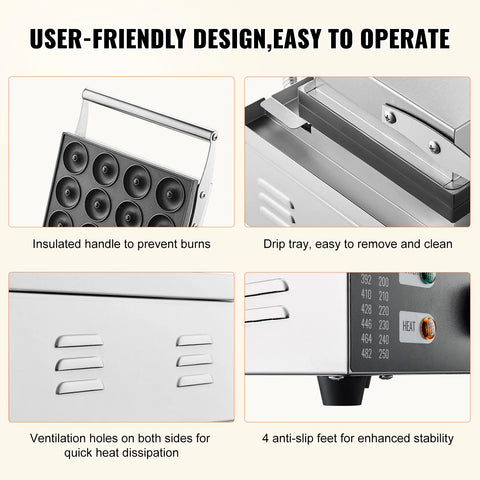 User-centric Design: Our commercial waffle donut machine features include a heat-resistant stainless steel handle to prevent burns. A drip tray that's easy to detach for cleaning. Side vents for faster cooling, ensuring the machine works efficiently. Anti-slip feet for stability and usability of the donut maker.