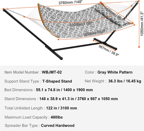 Deze ruime dubbele hangmat meet 1900 x 1400 mm, met een touwlengte van 60 cm. Met twee extra stalen kettingen van 36 cm is de totale lengte van de hangmat 3,66 m (12 voet). Hij is groot genoeg voor twee personen en kan maximaal 200 kg dragen.